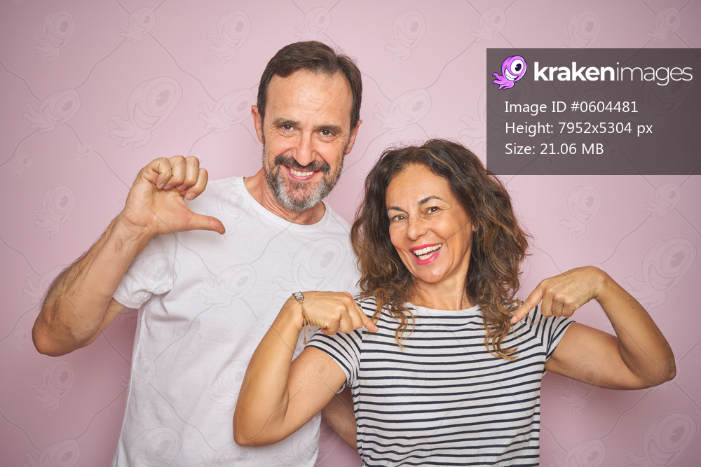 Beautiful middle age couple together standing over isolated pink background looking confident with smile on face, pointing oneself with fingers proud and happy. - Kraken Images