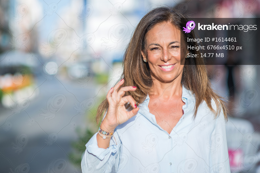 Beautiful middle age hispanic woman at the city street on a sunny day doing ok sign with fingers, excellent symbol