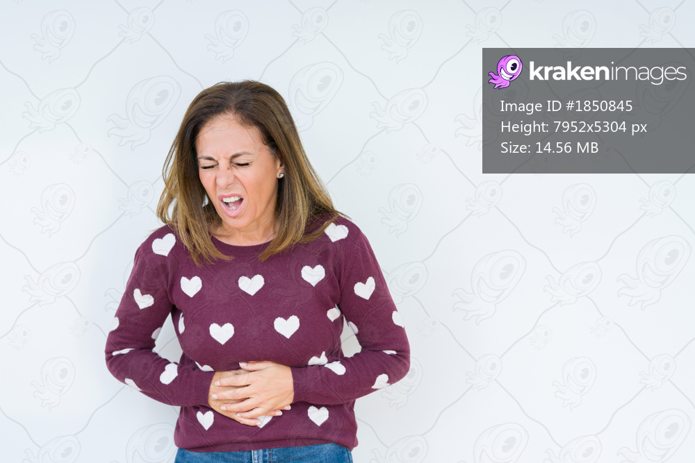 Beautiful middle age woman wearing heart sweater over isolated background with hand on stomach because indigestion, painful illness feeling unwell. Ache concept. - Kraken Images