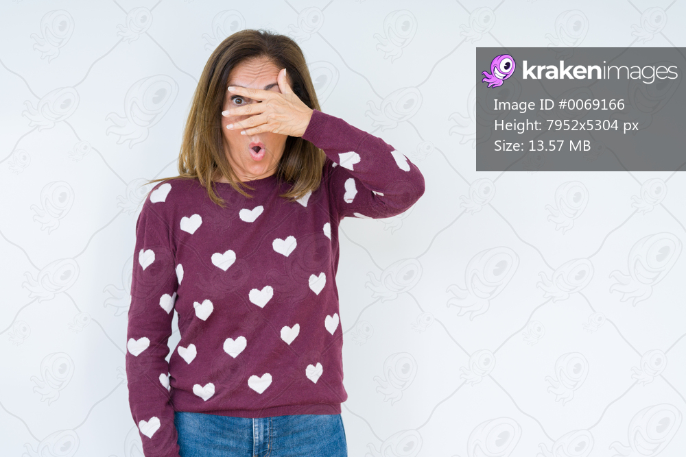 Beautiful middle age woman wearing heart sweater over isolated background peeking in shock covering face and eyes with hand, looking through fingers with embarrassed expression. - Kraken Images