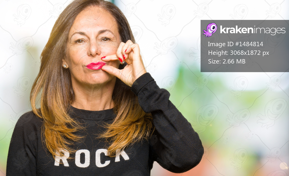 Beautiful middle age woman wearing rock and roll sweater mouth and lips shut as zip with fingers. Secret and silent, taboo talking
