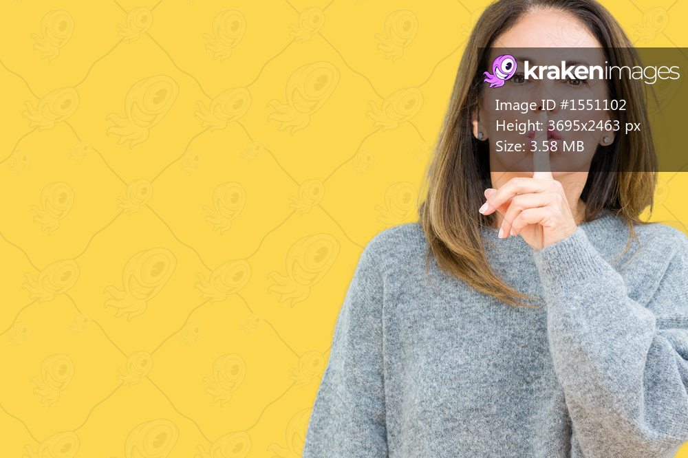 Beautiful middle age woman wearing winter sweater over isolated background asking to be quiet with finger on lips. Silence and secret concept.