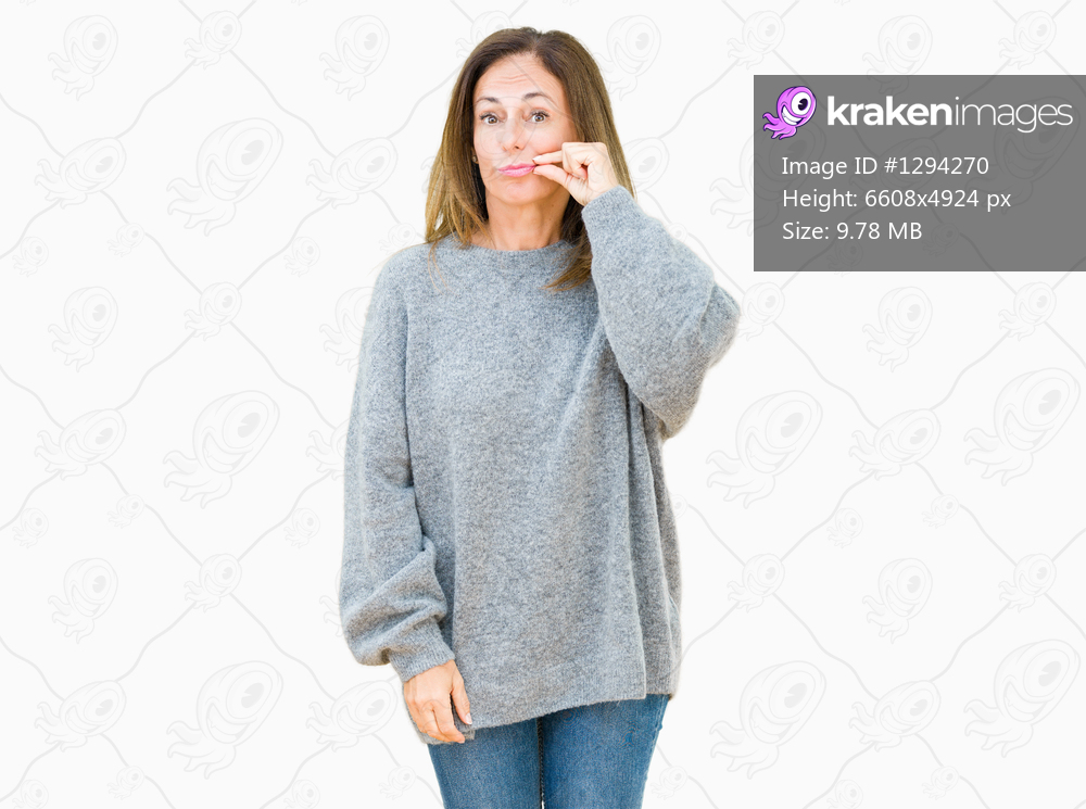 Beautiful middle age woman wearing winter sweater over isolated background mouth and lips shut as zip with fingers. Secret and silent, taboo talking