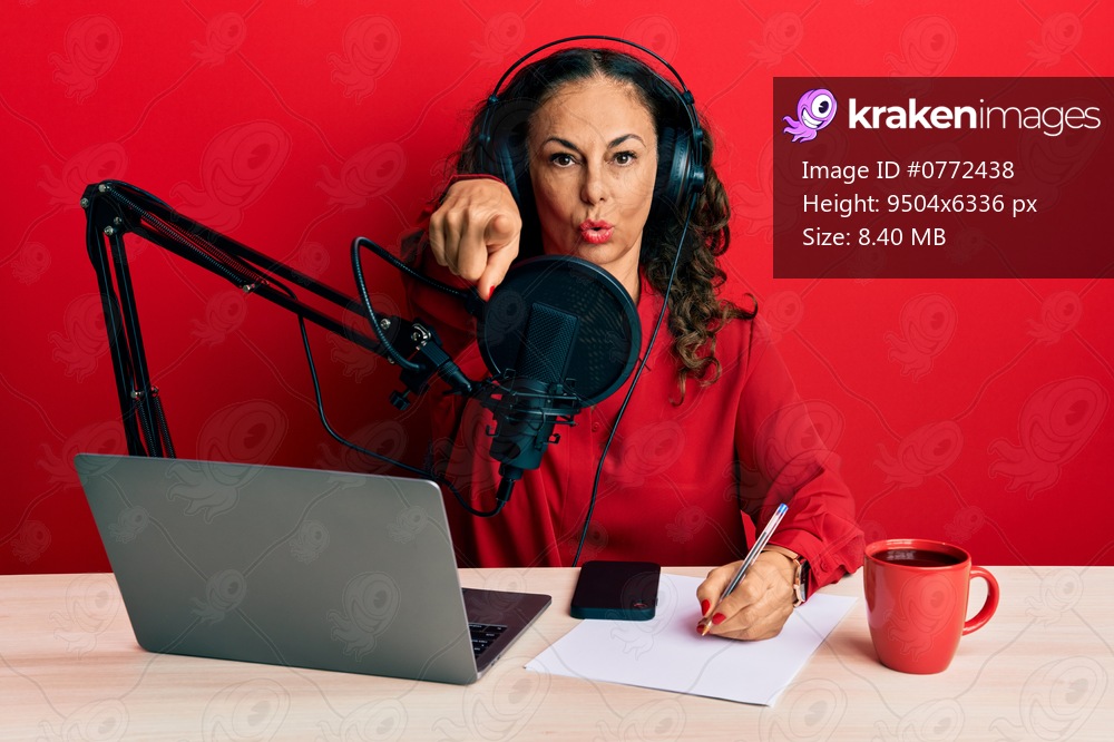Beautiful middle age woman working at radio studio pointing with finger to the camera and to you, confident gesture looking serious