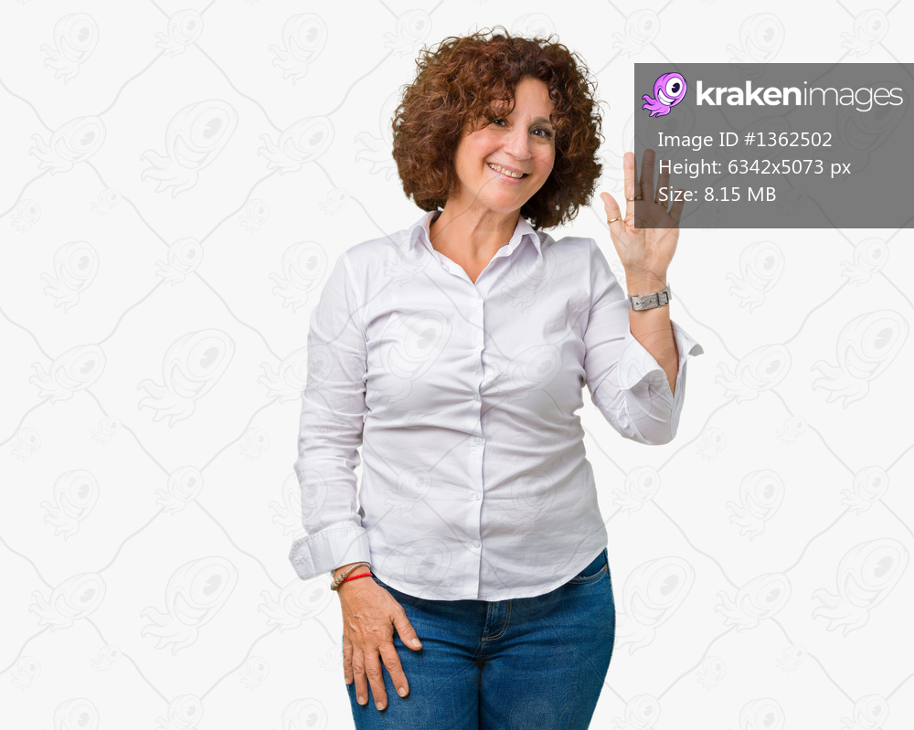 Beautiful middle ager senior businees woman over isolated background Waiving saying hello happy and smiling, friendly welcome gesture