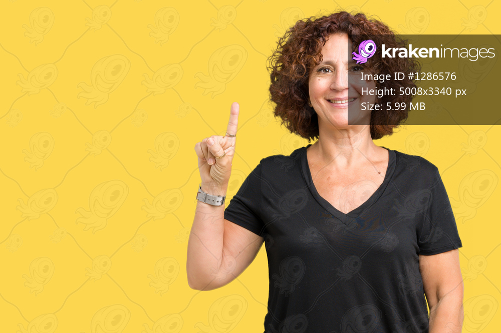 Beautiful middle ager senior woman over isolated background showing and pointing up with finger number one while smiling confident and happy.