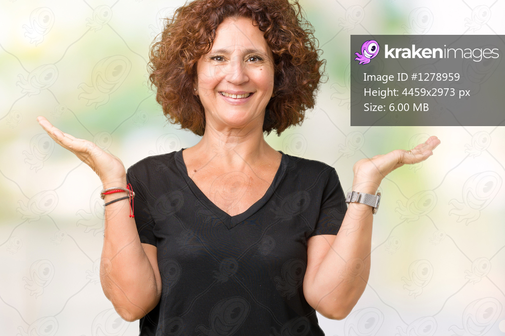 Beautiful middle ager senior woman over isolated background Smiling showing both hands open palms, presenting and advertising comparison and balance