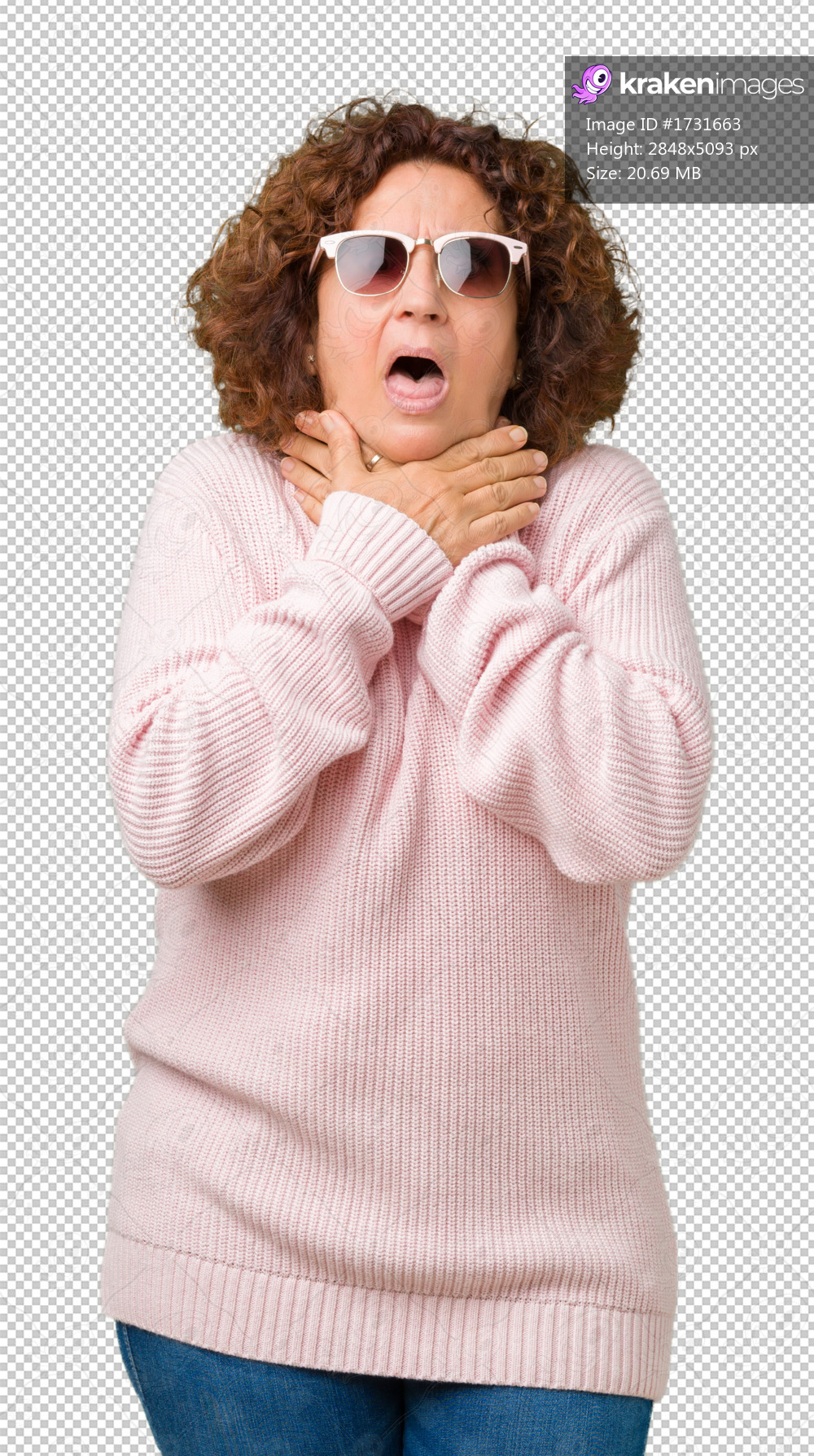 Beautiful middle ager senior woman wearing pink sweater and sunglasses over isolated background shouting and suffocate because painful strangle. Health problem. Asphyxiate and suicide concept. - Kraken Images