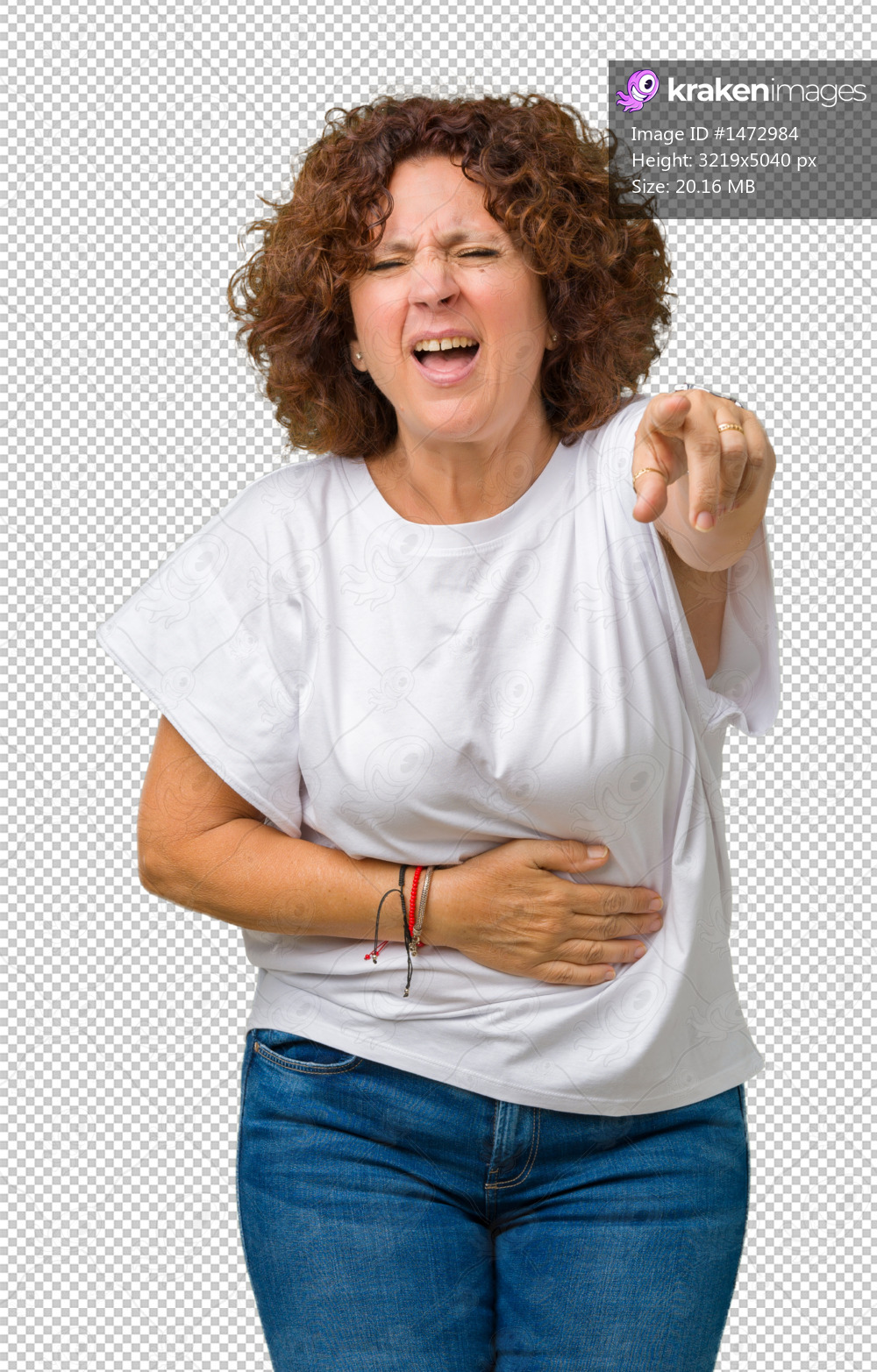 Beautiful middle ager senior woman wearing white t-shirt over isolated background Laughing of you, pointing to the camera with finger hand over chest, shame expression - Kraken Images