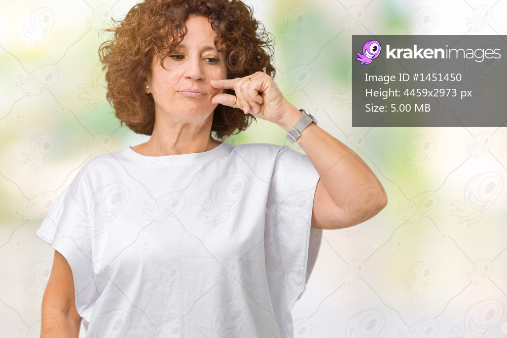Beautiful middle ager senior woman wearing white t-shirt over isolated background mouth and lips shut as zip with fingers. Secret and silent, taboo talking - Kraken Images