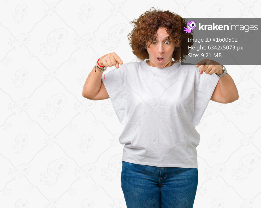 Beautiful middle ager senior woman wearing white t-shirt over isolated background Pointing down with fingers showing advertisement, surprised face and open mouth - Kraken Images