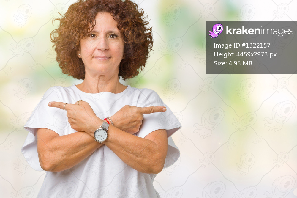 Beautiful middle ager senior woman wearing white t-shirt over isolated background Pointing to both sides with fingers, different direction disagree