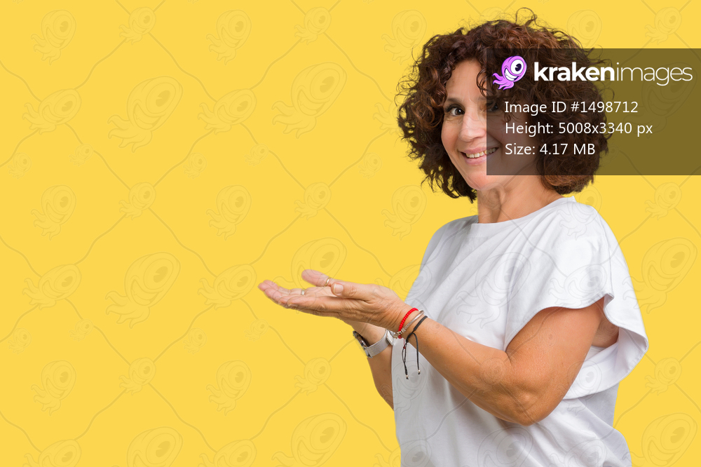 Beautiful middle ager senior woman wearing white t-shirt over isolated background Pointing to the side with hand and open palm, presenting ad smiling happy and confident - Kraken Images