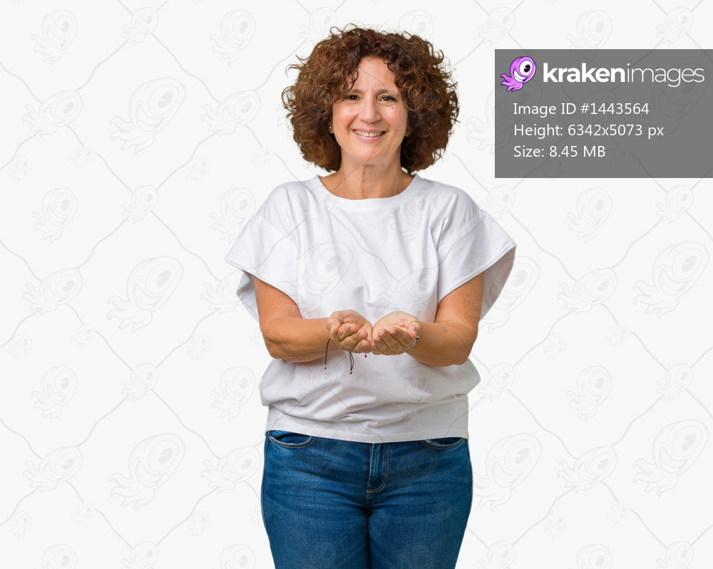 Beautiful middle ager senior woman wearing white t-shirt over isolated background Smiling with hands palms together receiving or giving gesture. Hold and protection - Kraken Images