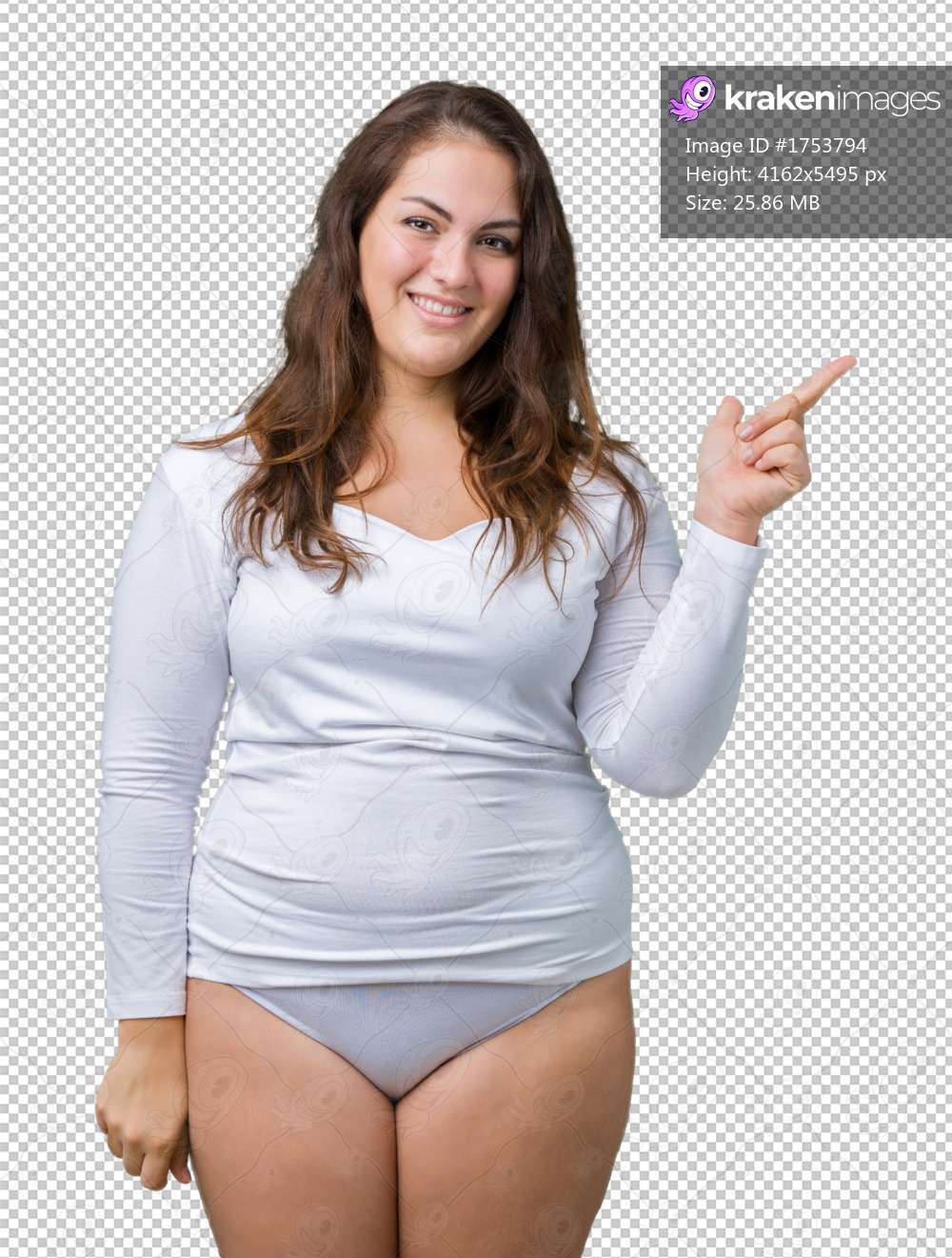 Beautiful plus size young overwight woman wearing white underwear over isolated background with a big smile on face, pointing with hand and finger to the side looking at the camera. - Kraken Images