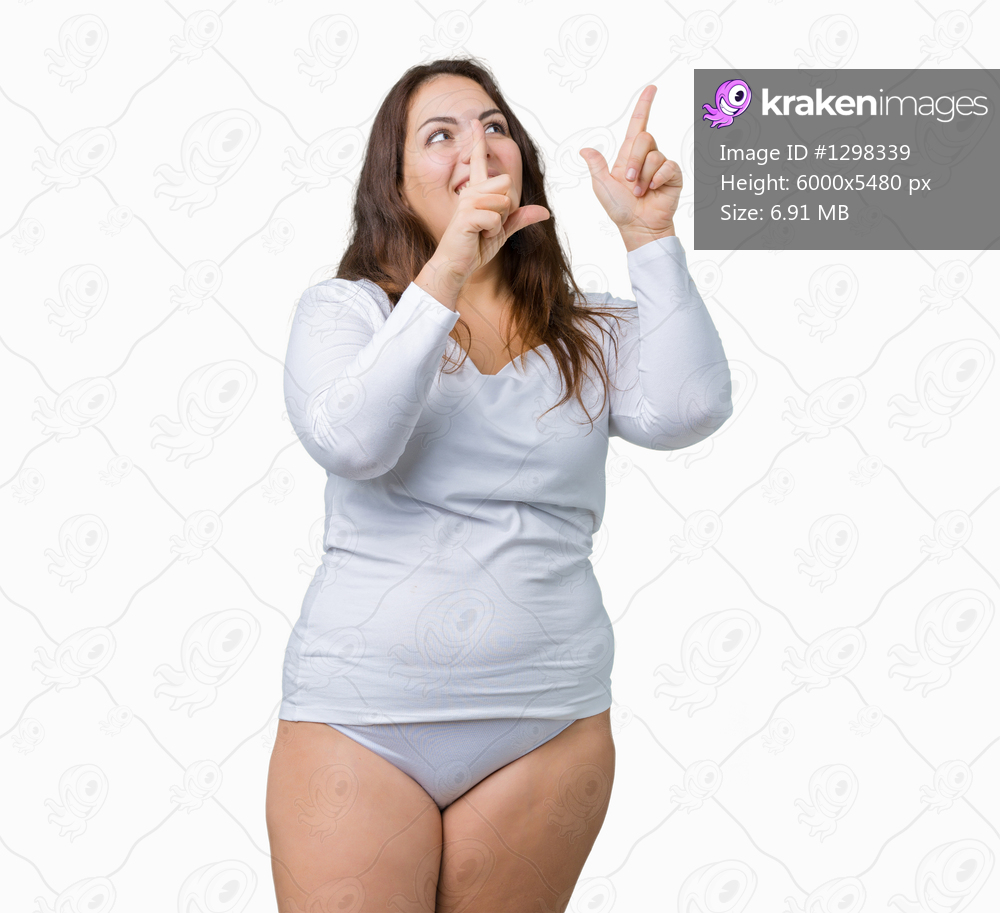 Beautiful plus size young overwight woman wearing white underwear over isolated background cheerful with a smile of face pointing with hand and finger up to the side with happy and natural expression on face - Kraken Images