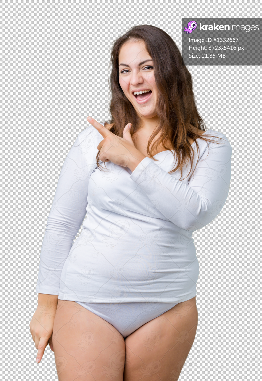 Beautiful plus size young overwight woman wearing white underwear over isolated background cheerful with a smile of face pointing with hand and finger up to the side with happy and natural expression on face - Kraken Images