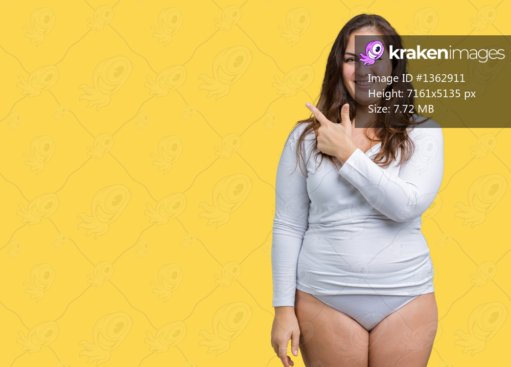 Beautiful plus size young overwight woman wearing white underwear over isolated background cheerful with a smile of face pointing with hand and finger up to the side with happy and natural expression on face - Kraken Images