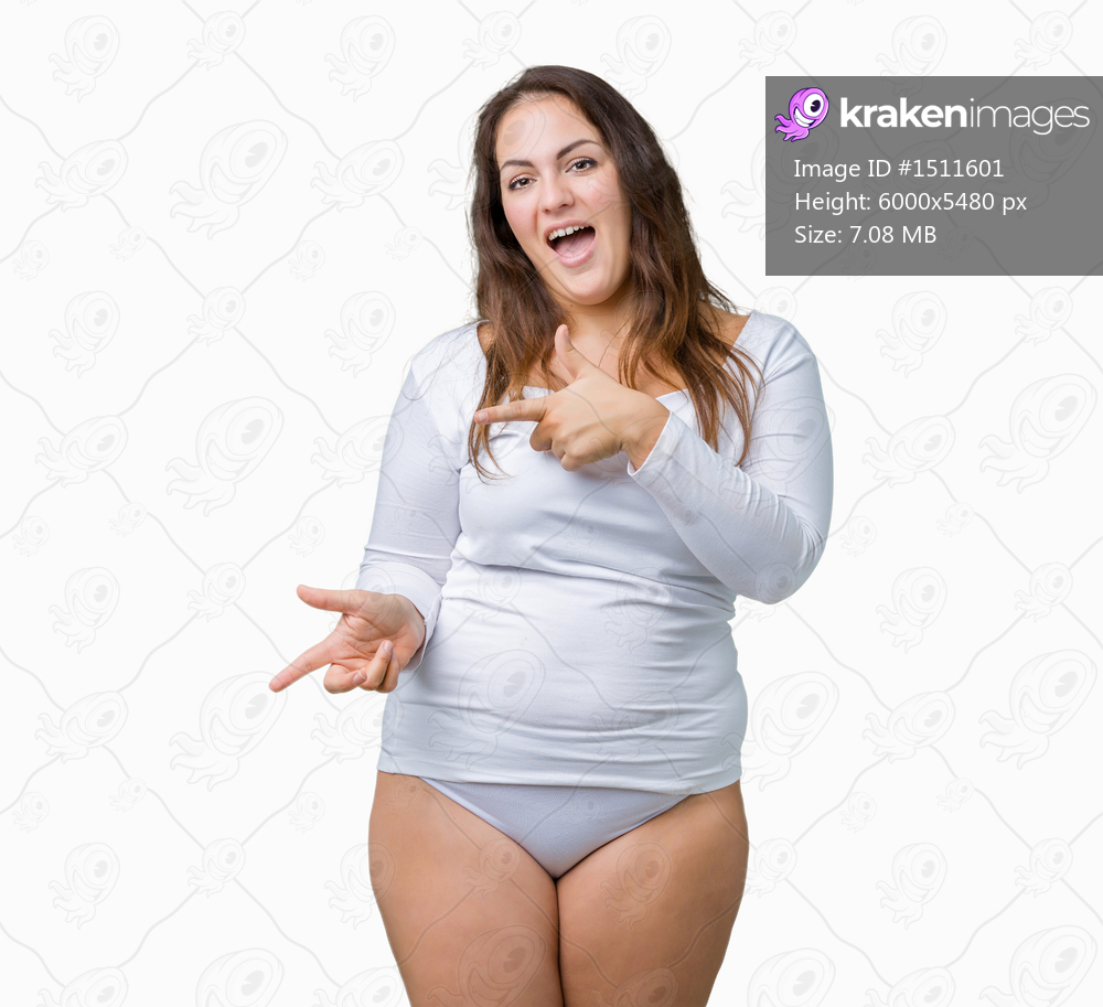 Beautiful plus size young overwight woman wearing white underwear over isolated background cheerful with a smile of face pointing with hand and finger up to the side with happy and natural expression on face - Kraken Images