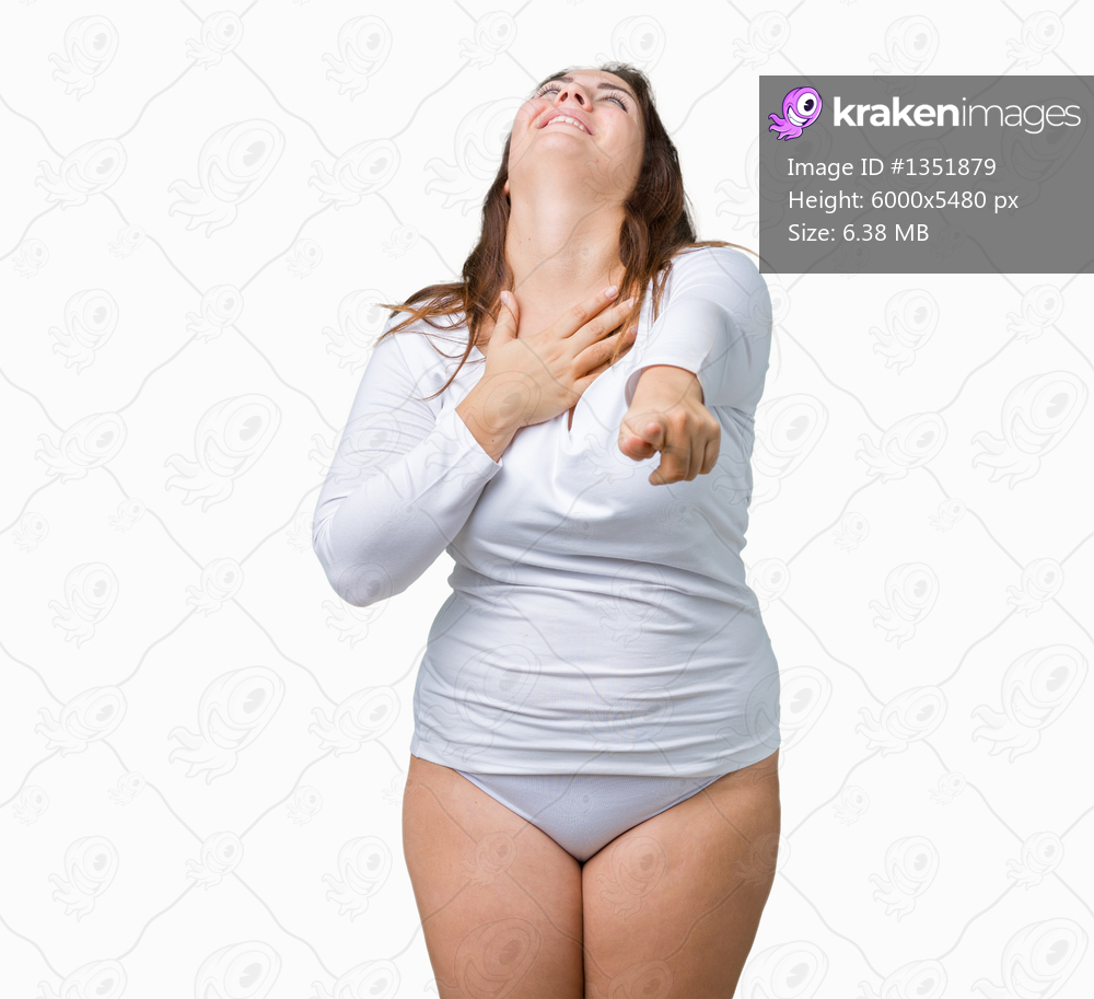 Beautiful plus size young overwight woman wearing white underwear over isolated background Laughing of you, pointing to the camera with finger hand over chest, shame expression - Kraken Images
