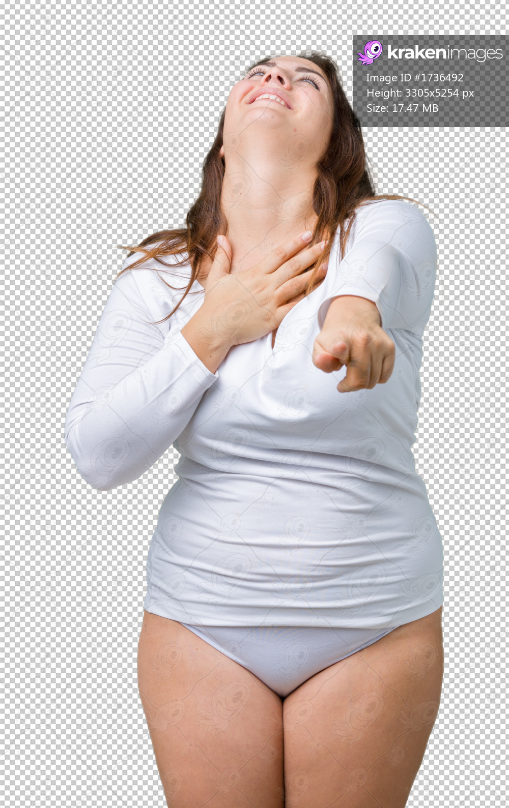 Beautiful plus size young overwight woman wearing white underwear over isolated background Laughing of you, pointing to the camera with finger hand over chest, shame expression - Kraken Images