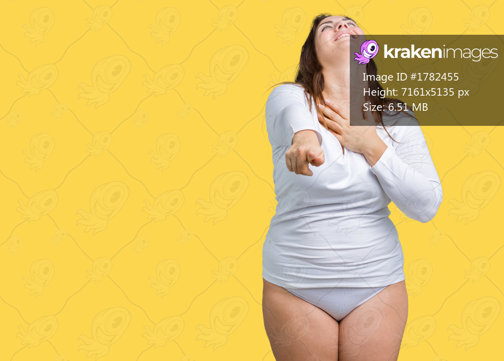 Beautiful plus size young overwight woman wearing white underwear over isolated background Laughing of you, pointing to the camera with finger hand over chest, shame expression - Kraken Images