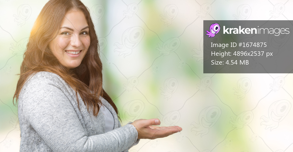 Beautiful plus size young woman wearing winter jacket over isolated background Pointing to the side with hand and open palm, presenting ad smiling happy and confident - Kraken Images