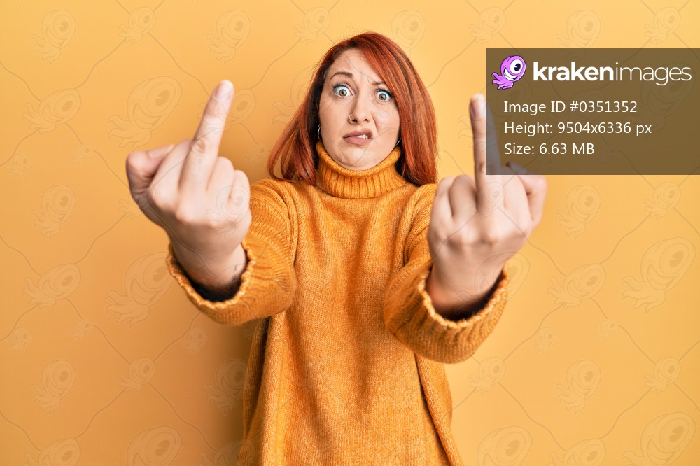Beautiful redhead woman showing middle finger doing bad gesture in shock face, looking skeptical and sarcastic, surprised with open mouth