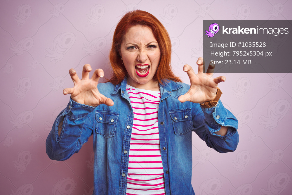 Beautiful redhead woman wearing denim shirt and striped t-shirt over isolated pink background smiling funny doing claw gesture as cat, aggressive and sexy expression