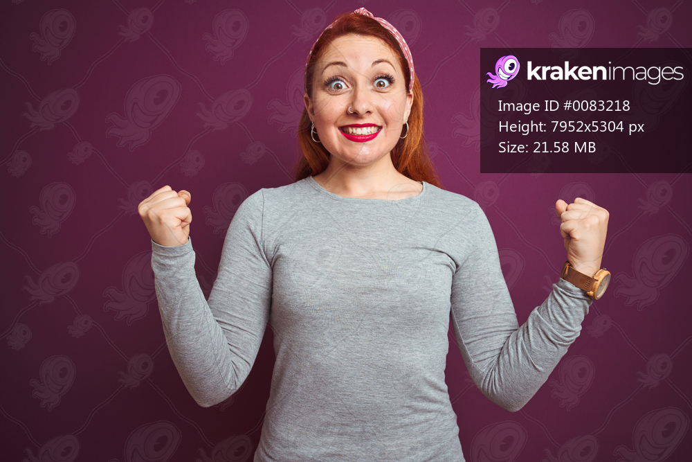 Beautiful redhead woman wearing grey t-shirt and diadem over isolated purple background celebrating surprised and amazed for success with arms raised and open eyes. Winner concept. - Kraken Images
