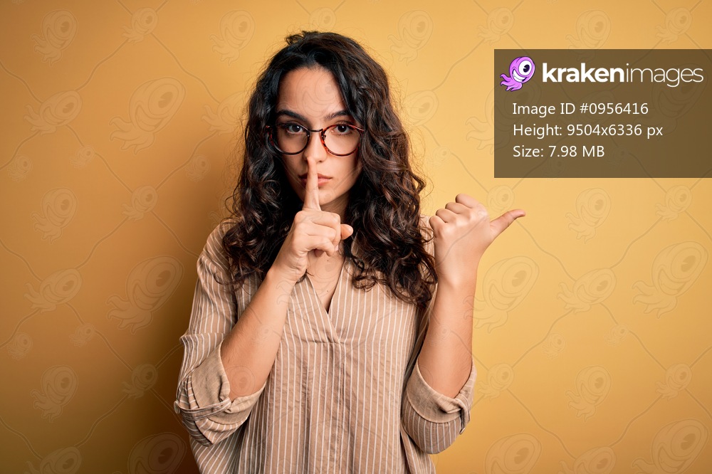 Beautiful woman with curly hair wearing striped shirt and glasses over yellow background asking to be quiet with finger on lips pointing with hand to the side. Silence and secret concept. - Kraken Images