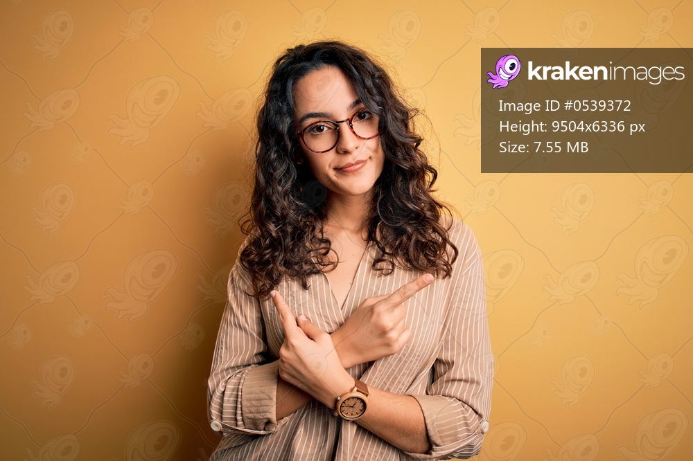 Beautiful woman with curly hair wearing striped shirt and glasses over yellow background Pointing to both sides with fingers, different direction disagree - Kraken Images