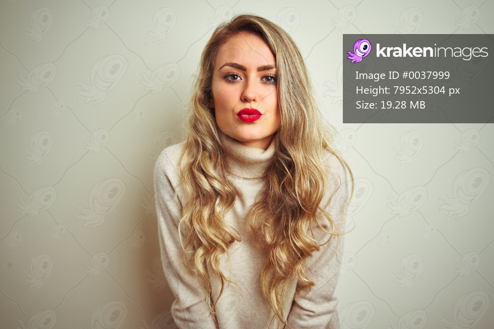 Beautiful woman wearing winter turtleneck sweater over isolated white background looking at the camera blowing a kiss on air being lovely and sexy. Love expression. - Kraken Images