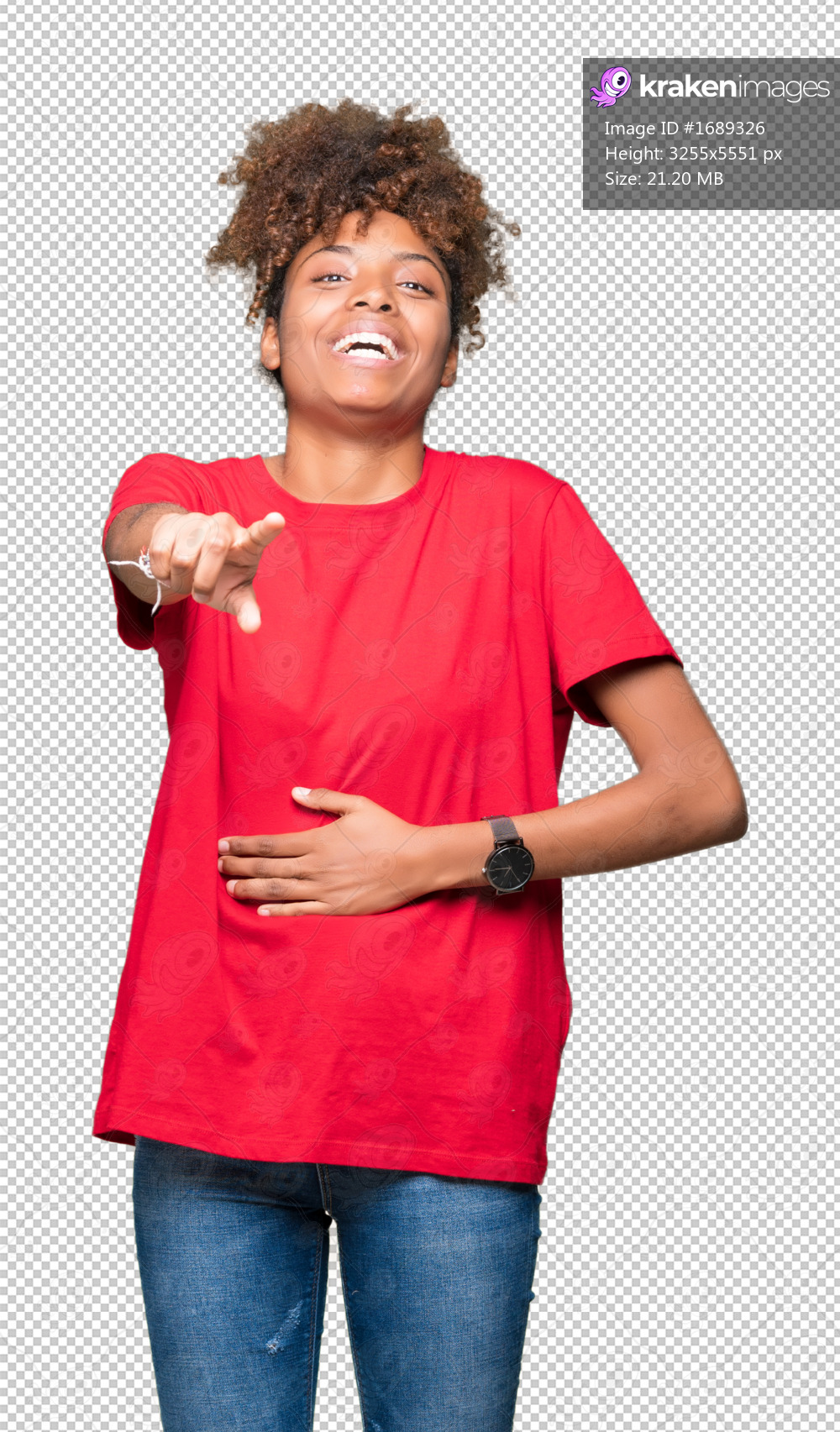 Beautiful young african american woman over isolated background Laughing of you, pointing to the camera with finger hand over chest, shame expression