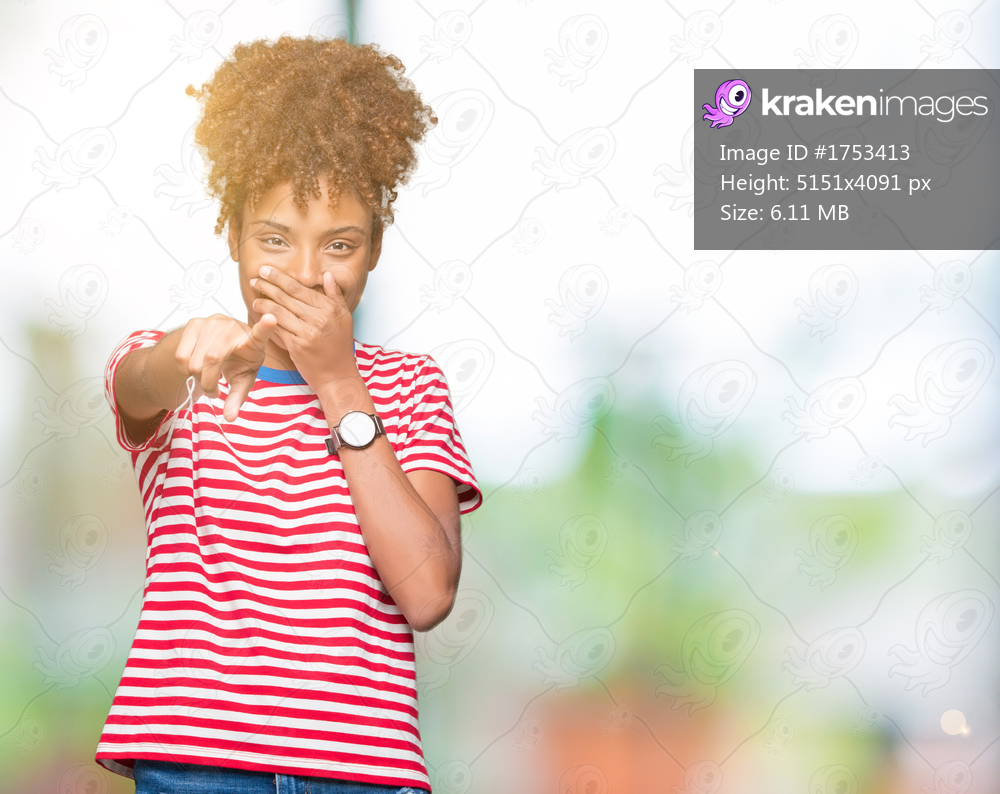Beautiful young african american woman over isolated background Laughing of you, pointing to the camera with finger hand over mouth, shame expression