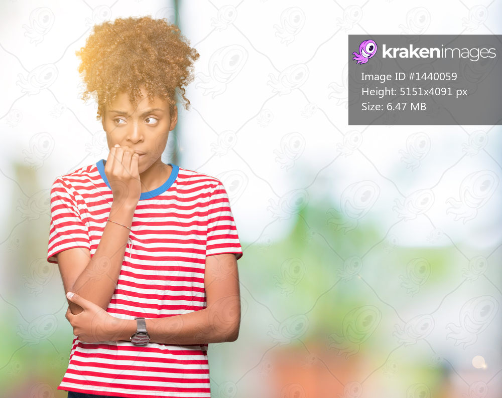Beautiful young african american woman over isolated background looking stressed and nervous with hands on mouth biting nails. Anxiety problem.