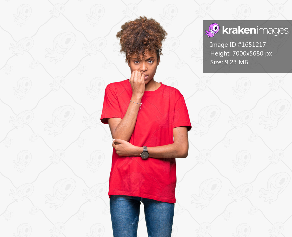 Beautiful young african american woman over isolated background looking stressed and nervous with hands on mouth biting nails. Anxiety problem.