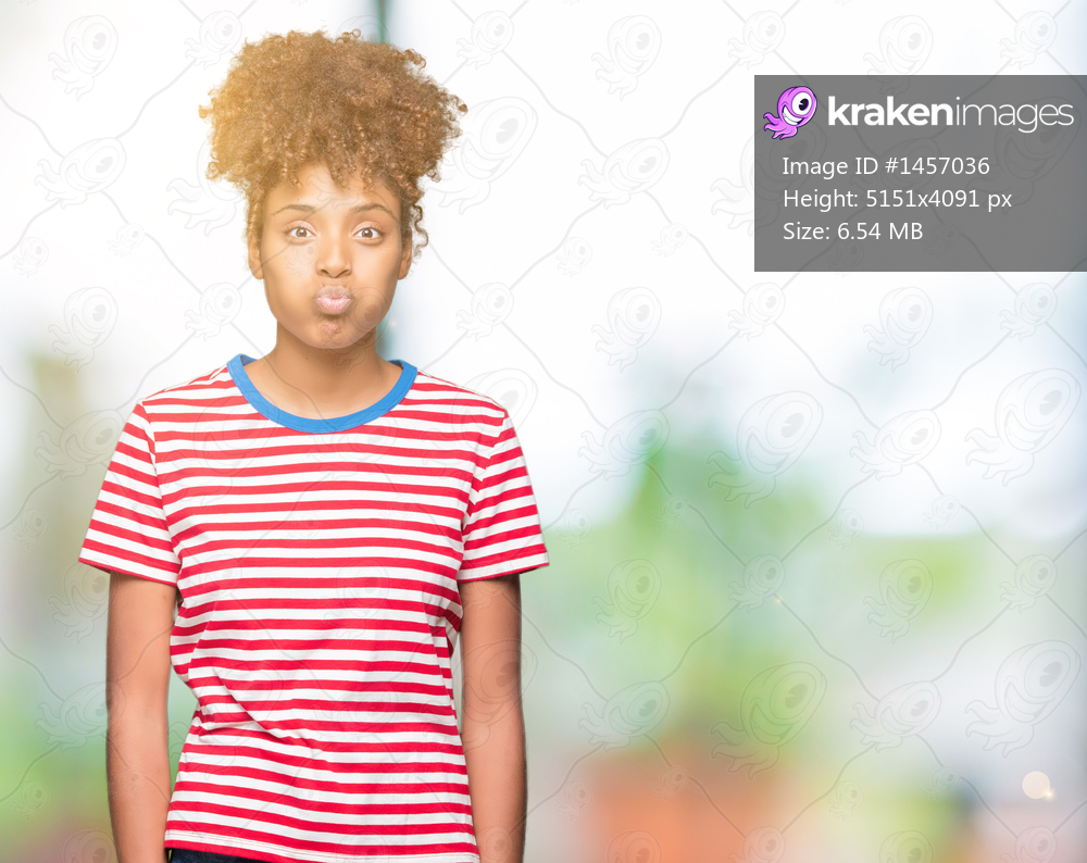 Beautiful young african american woman over isolated background puffing cheeks with funny face. Mouth inflated with air, crazy expression.