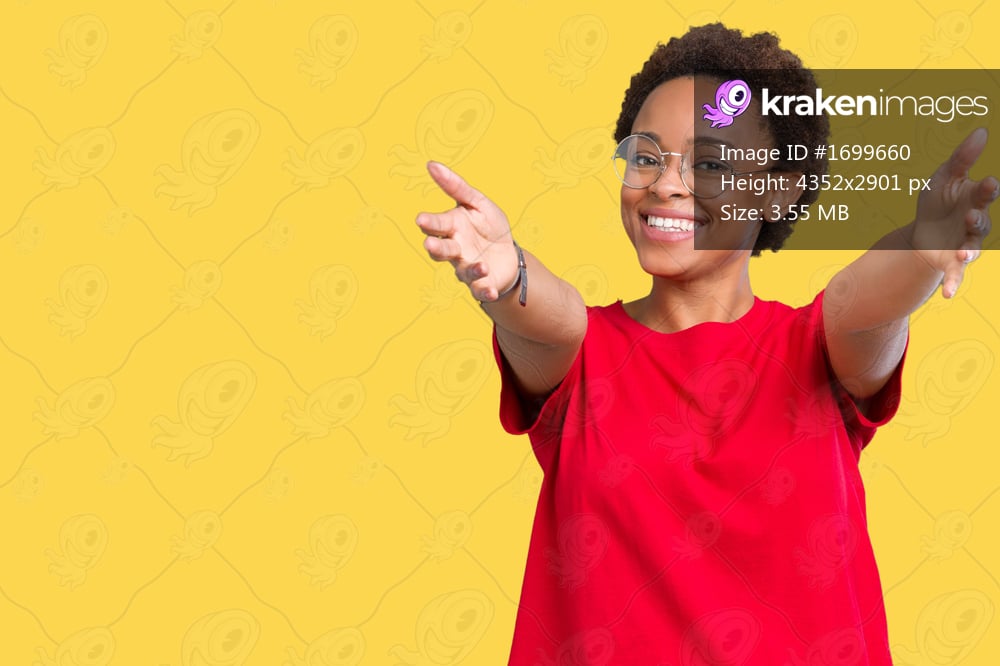 Beautiful young african american woman wearing glasses over isolated background looking at the camera smiling with open arms for hug. Cheerful expression embracing happiness. - Kraken Images