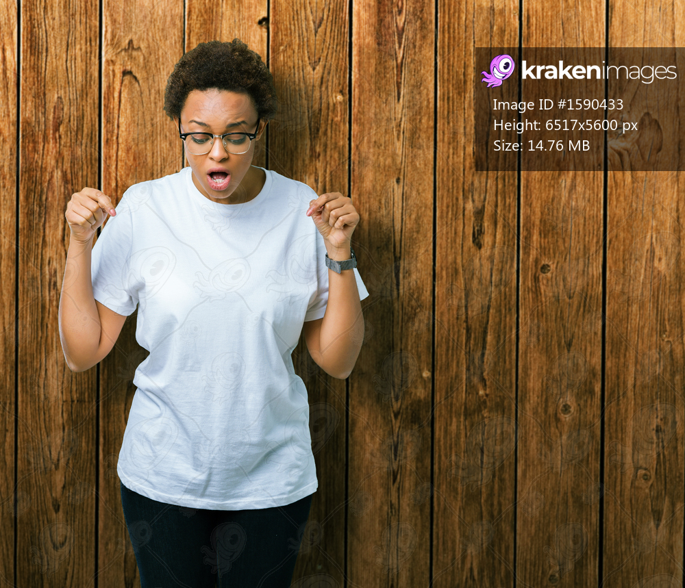 Beautiful young african american woman wearing glasses over isolated background Pointing down with fingers showing advertisement, surprised face and open mouth - Kraken Images