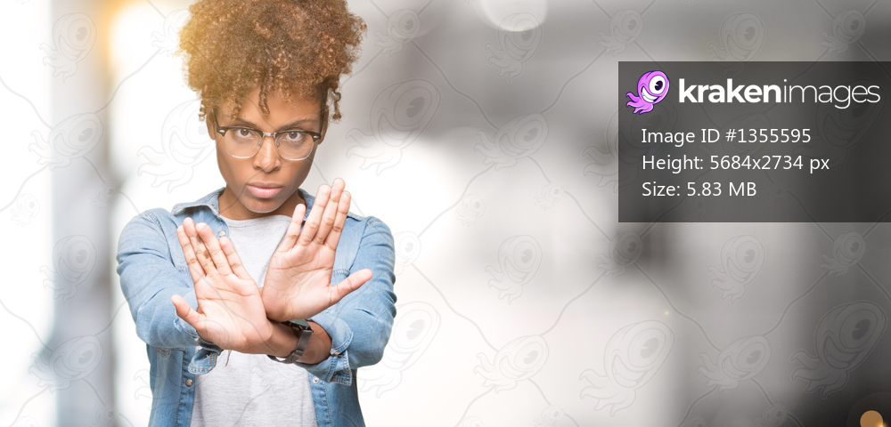 Beautiful young african american woman wearing glasses over isolated background Rejection expression crossing arms and palms doing negative sign, angry face - Kraken Images
