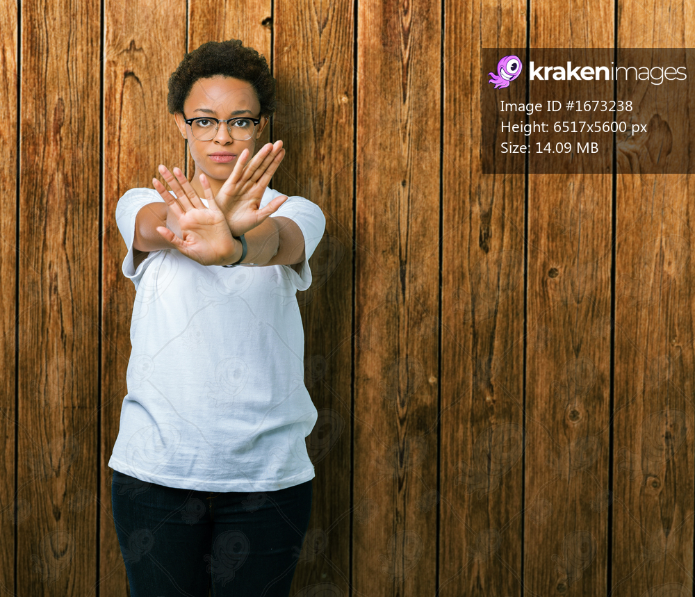 Beautiful young african american woman wearing glasses over isolated background Rejection expression crossing arms and palms doing negative sign, angry face - Kraken Images