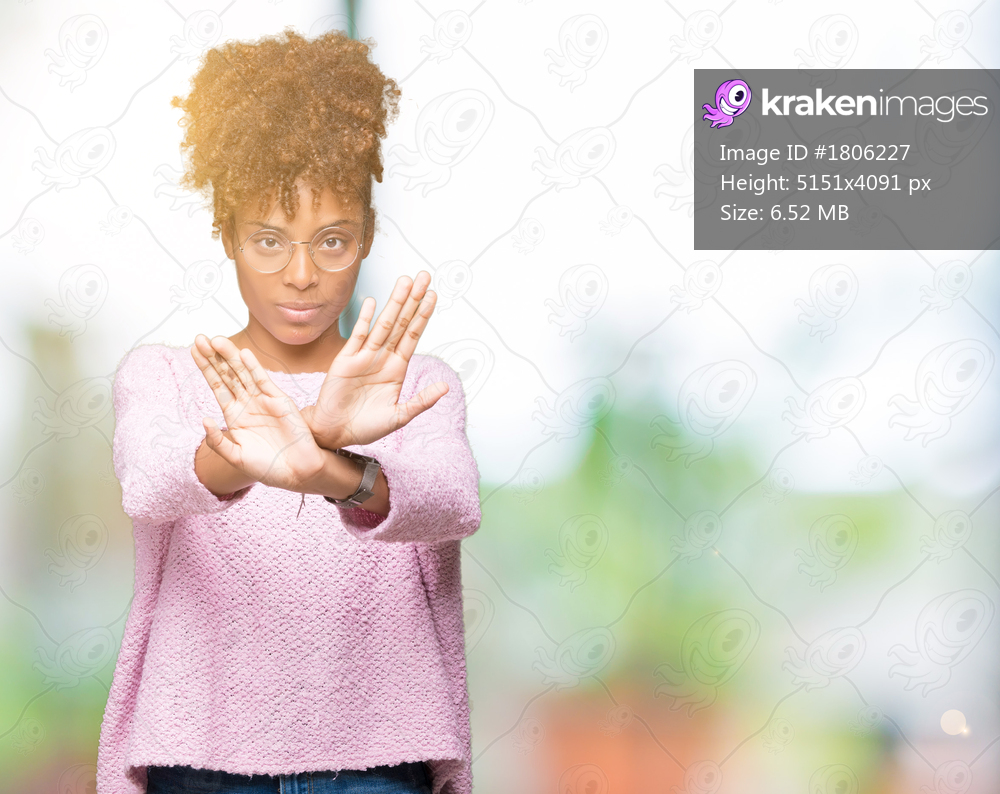 Beautiful young african american woman wearing glasses over isolated background Rejection expression crossing arms and palms doing negative sign, angry face - Kraken Images