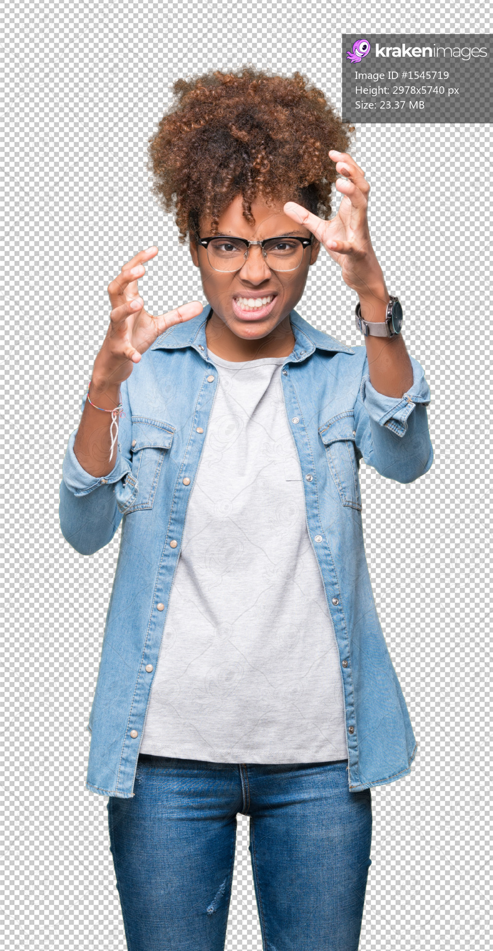Beautiful young african american woman wearing glasses over isolated background Shouting frustrated with rage, hands trying to strangle, yelling mad