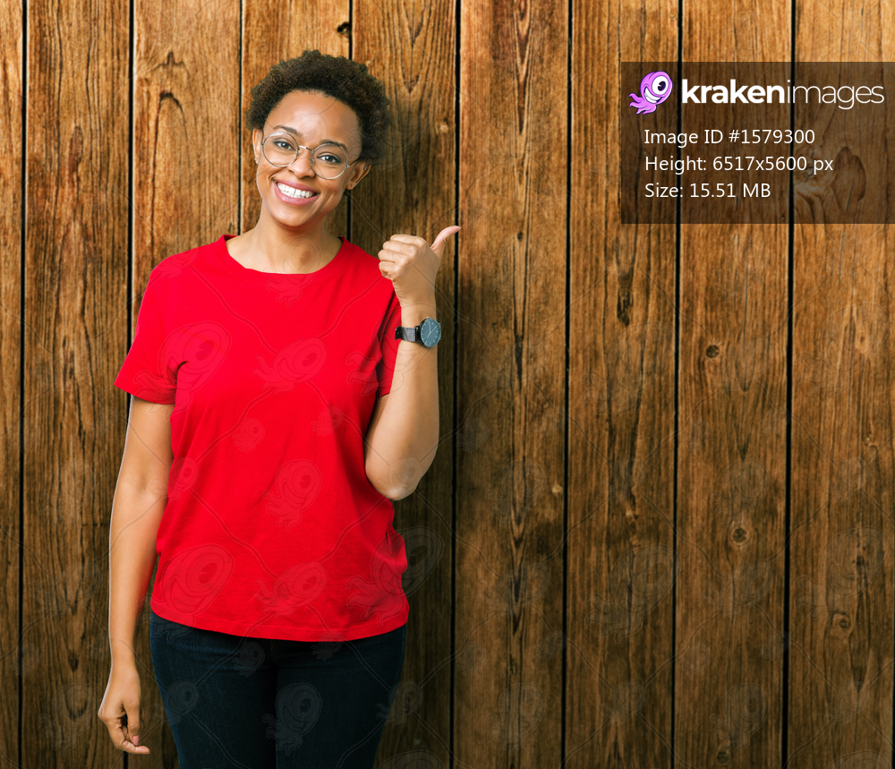 Beautiful young african american woman wearing glasses over isolated background smiling with happy face looking and pointing to the side with thumb up. - Kraken Images