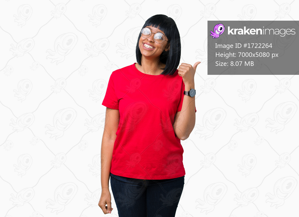 Beautiful young african american woman wearing glasses over isolated background smiling with happy face looking and pointing to the side with thumb up. - Kraken Images