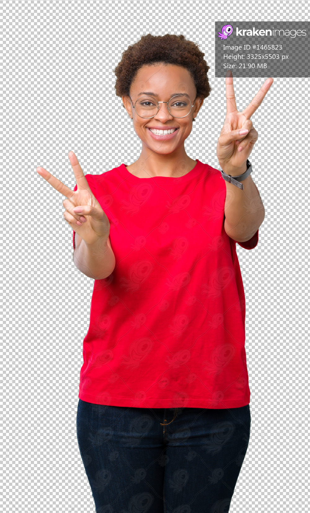 Beautiful young african american woman wearing glasses over isolated background smiling looking to the camera showing fingers doing victory sign. Number two. - Kraken Images