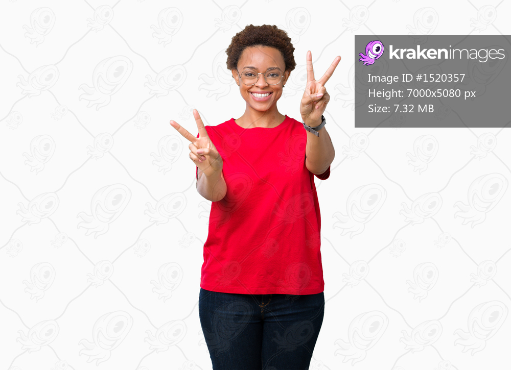 Beautiful young african american woman wearing glasses over isolated background smiling looking to the camera showing fingers doing victory sign. Number two. - Kraken Images