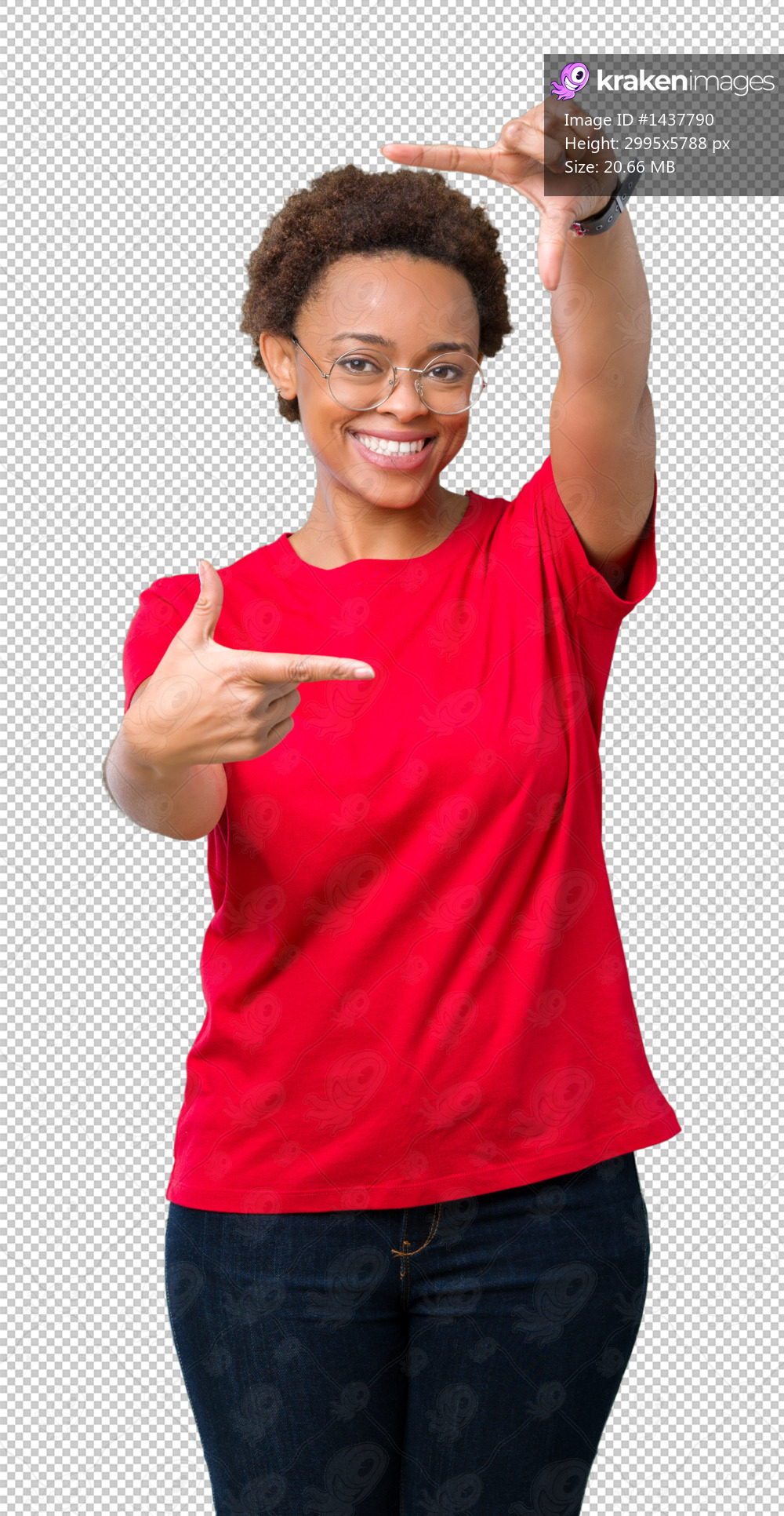 Beautiful young african american woman wearing glasses over isolated background smiling making frame with hands and fingers with happy face. Creativity and photography concept. - Kraken Images