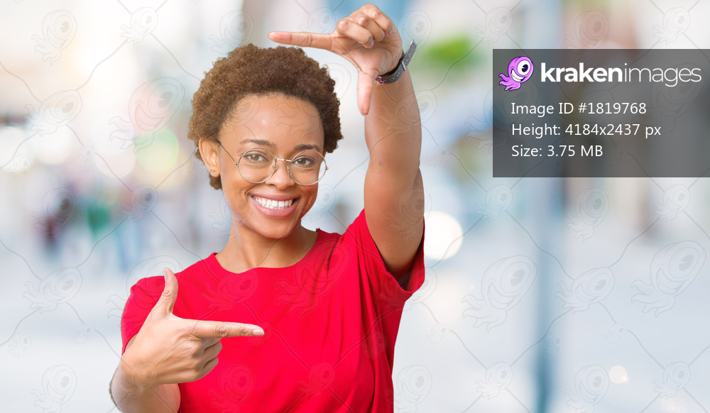 Beautiful young african american woman wearing glasses over isolated background smiling making frame with hands and fingers with happy face. Creativity and photography concept. - Kraken Images
